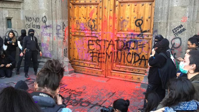 Arrojaron globos con pintura roja a la puerta Mariana y realizaron pintas en las paredes de Palacio. Algunas prendieron fuego a las mantas que cubren monumentos. recordaron que al día, un promedio de 12 mujeres son asesinadas en México.