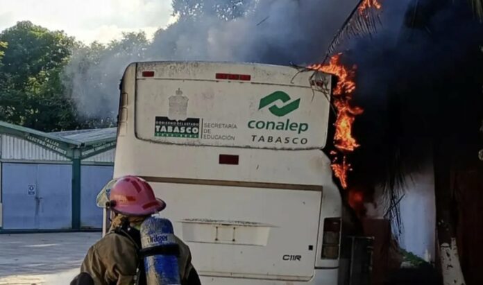 Alumnos del Conalep Plantel 51 de Villahermosa, Tabasco, incendiaron este jueves un autobús escolar en protesta por no recibir el beneficio de las becas del Bienestar.