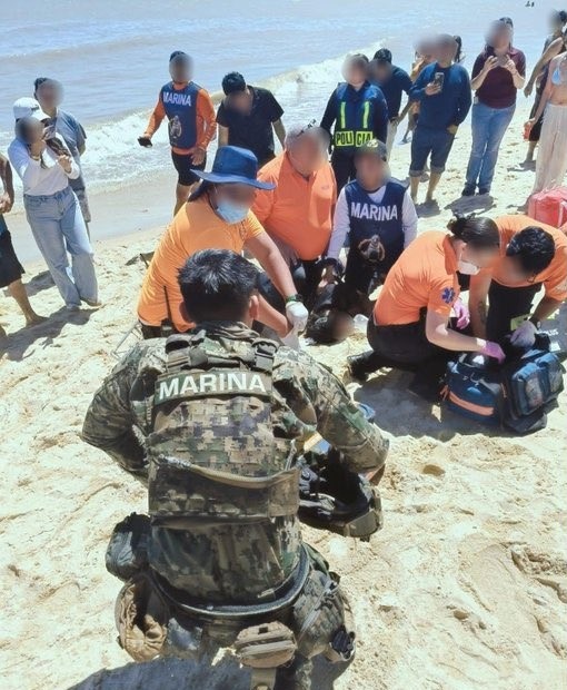Posteriormente, regresa cargando a una de las jóvenes, al tiempo que recibe auxilio de ciudadanos. Ya que la situación está controlada, el Marino procede de descansar arrodillándose en la arena, visiblemente exhausto./Agencias-PUNTOporPUNTO