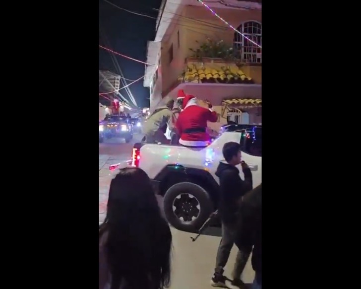 - En las imágenes, difundidas a través de la plataforma X, se aprecia una caravana de vehículos con figuras navideñas y varios hombres armados que lanzan dulces entre las familias. Incluso, uno de los sujetos parece vestido como Santa Claus, generando reacciones encontradas entre los internautas y pobladores de la zona.
