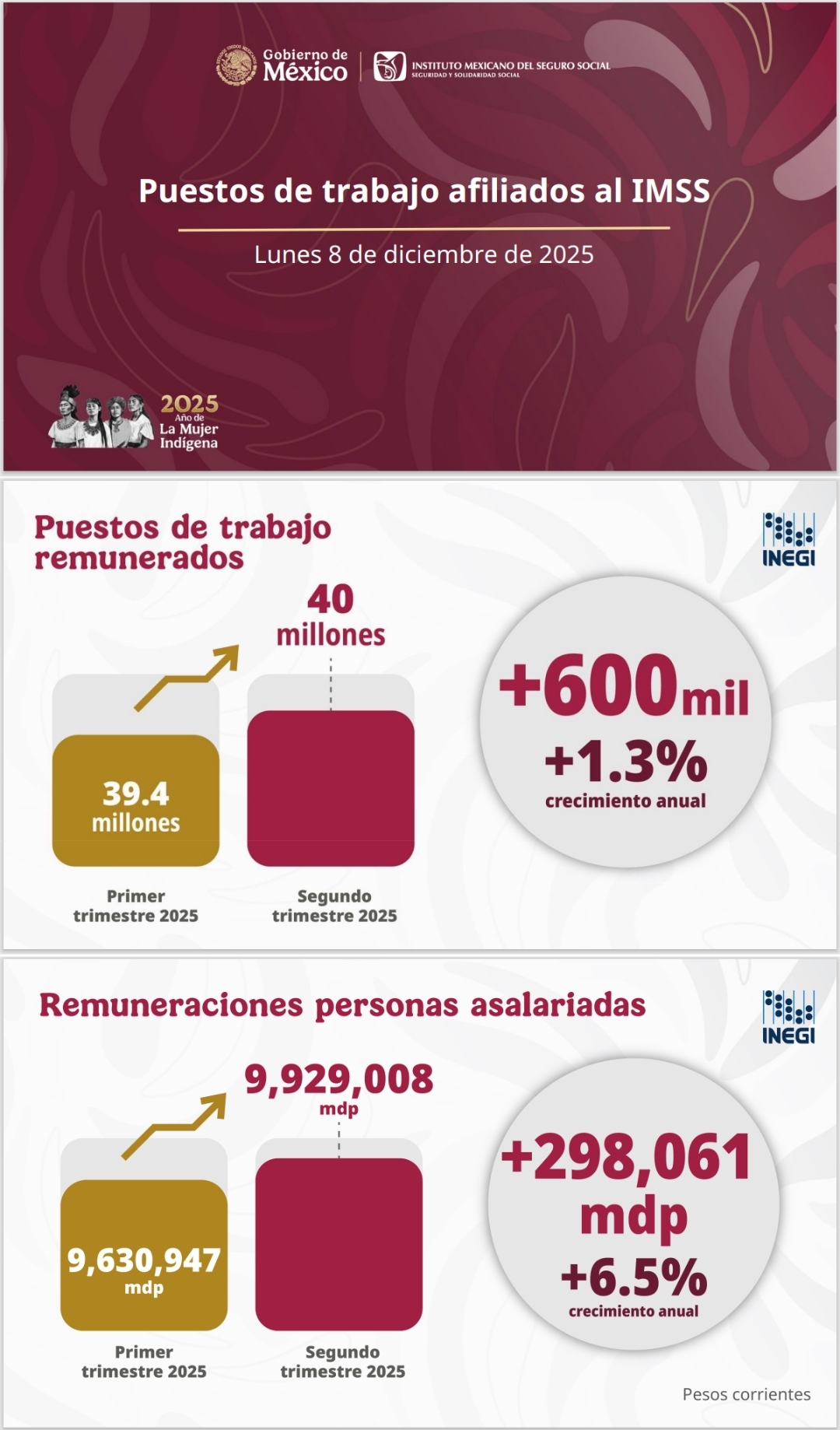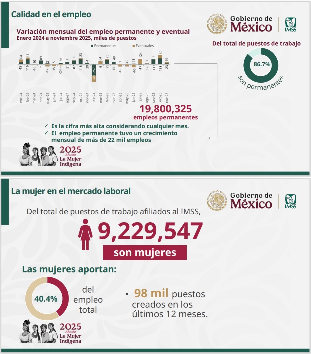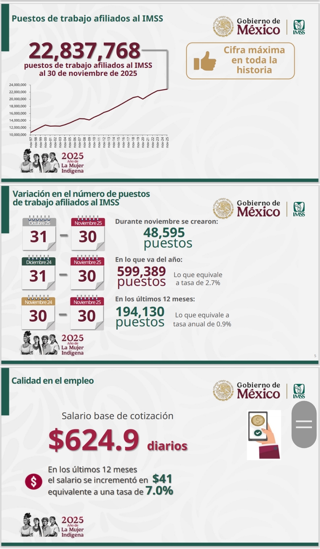 - Al cierre del 30 de noviembre, el IMSS reportó 22 millones 837 mil 768 empleos formales, una cifra que representa el nivel más alto en la historia del instituto. Tan solo durante noviembre se crearon 48 mil 595 nuevos puestos de trabajo, consolidando una tendencia positiva a lo largo del año.