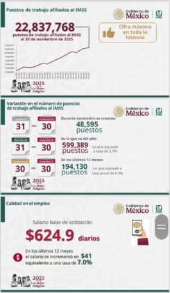 México alcanzó en noviembre un nuevo máximo histórico en empleo formal afiliado al Instituto Mexicano del Seguro Social (IMSS), con un total de 22 millones 837 mil 768 puestos de trabajo, de acuerdo con cifras oficiales presentadas este lunes. Se trata del registro más alto desde que se tiene información estadística en la institución.