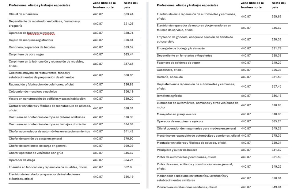- En la Zona Libre de la Frontera Norte, una franja con incentivos fiscales compuesta por 43 municipios fronterizos de Baja California, Sonora, Coahuila, Nuevo León y Tamaulipas, el salario mínimo crecerá de 419.88 pesos a 440.87 pesos por día, para un total de 13.409 pesos mensuales.