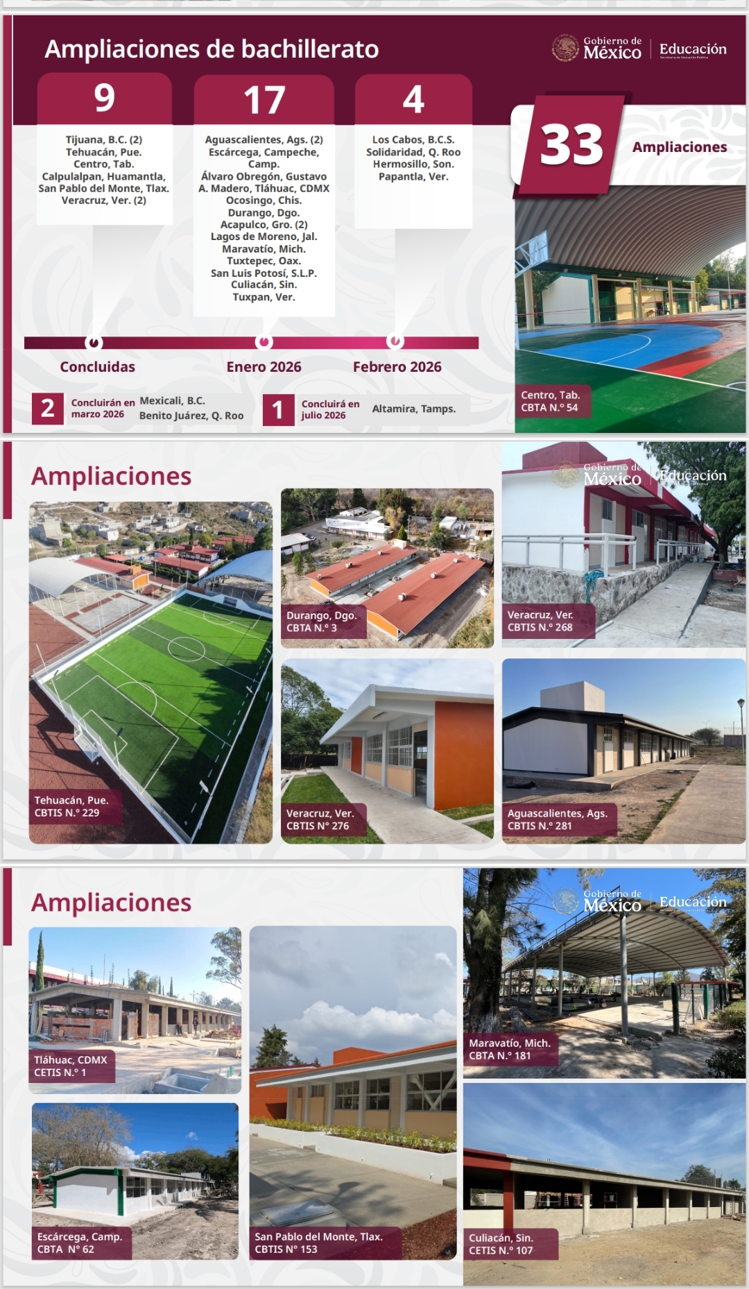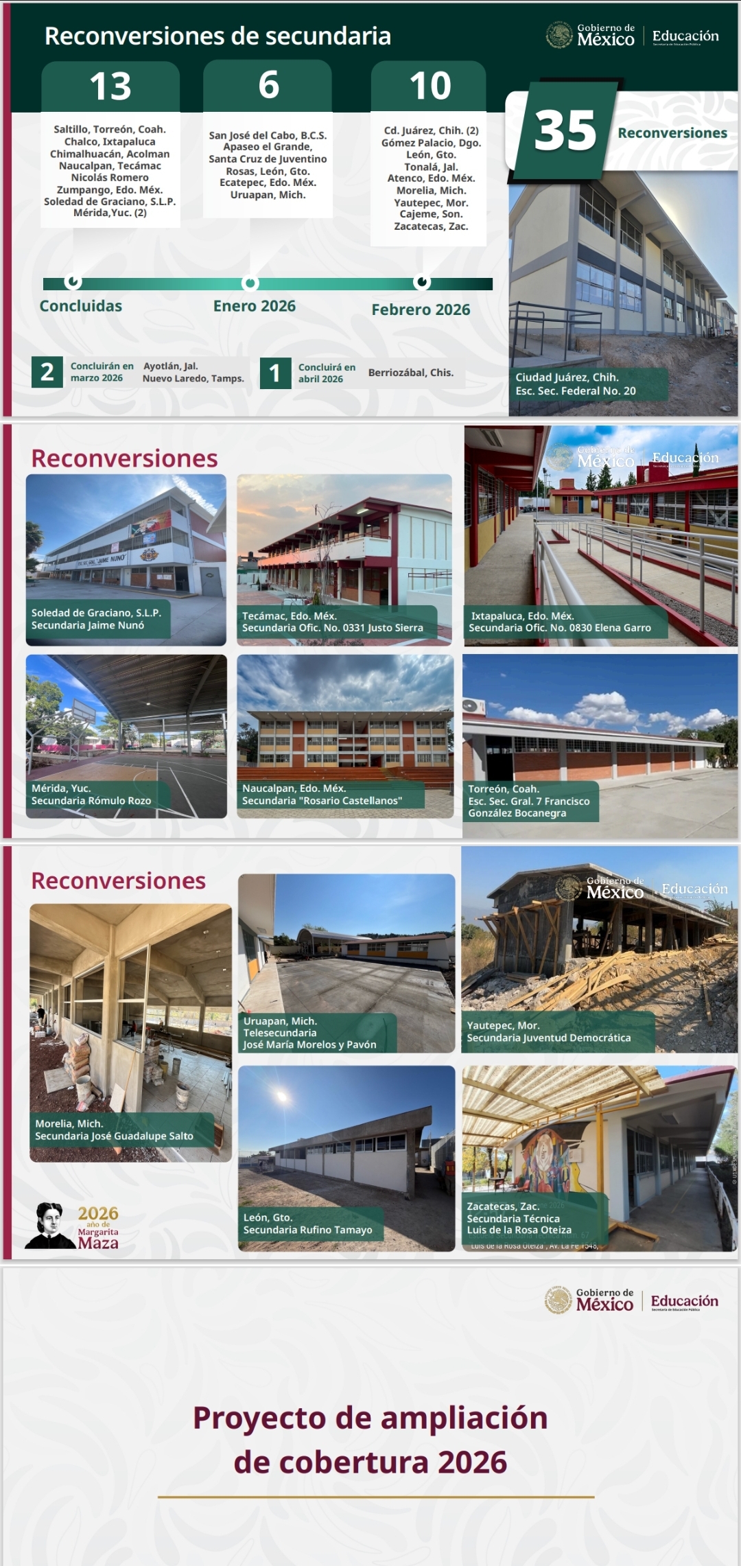 Además de la construcción de planteles, el plan contempla 20 nuevos bachilleratos tecnológicos, 33 ampliaciones y 35 reconversiones de secundarias sin turno vespertino, que por las tardes operan como preparatorias, estrategia que permite aprovechar infraestructura existente y ampliar la cobertura de forma inmediata.