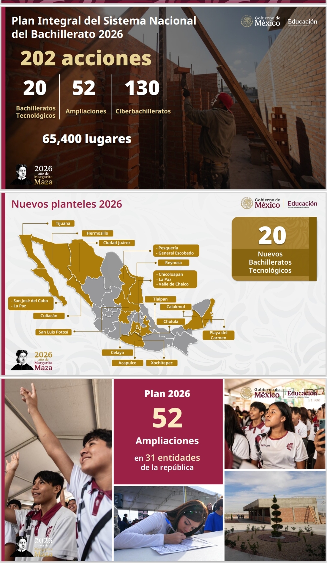 Como parte del Bachillerato Nacional, la Secretaría de Educación Pública (SEP) proyecta 202 acciones que permitirán la creación de 65,400 nuevos lugares en educación media superior durante 2026.