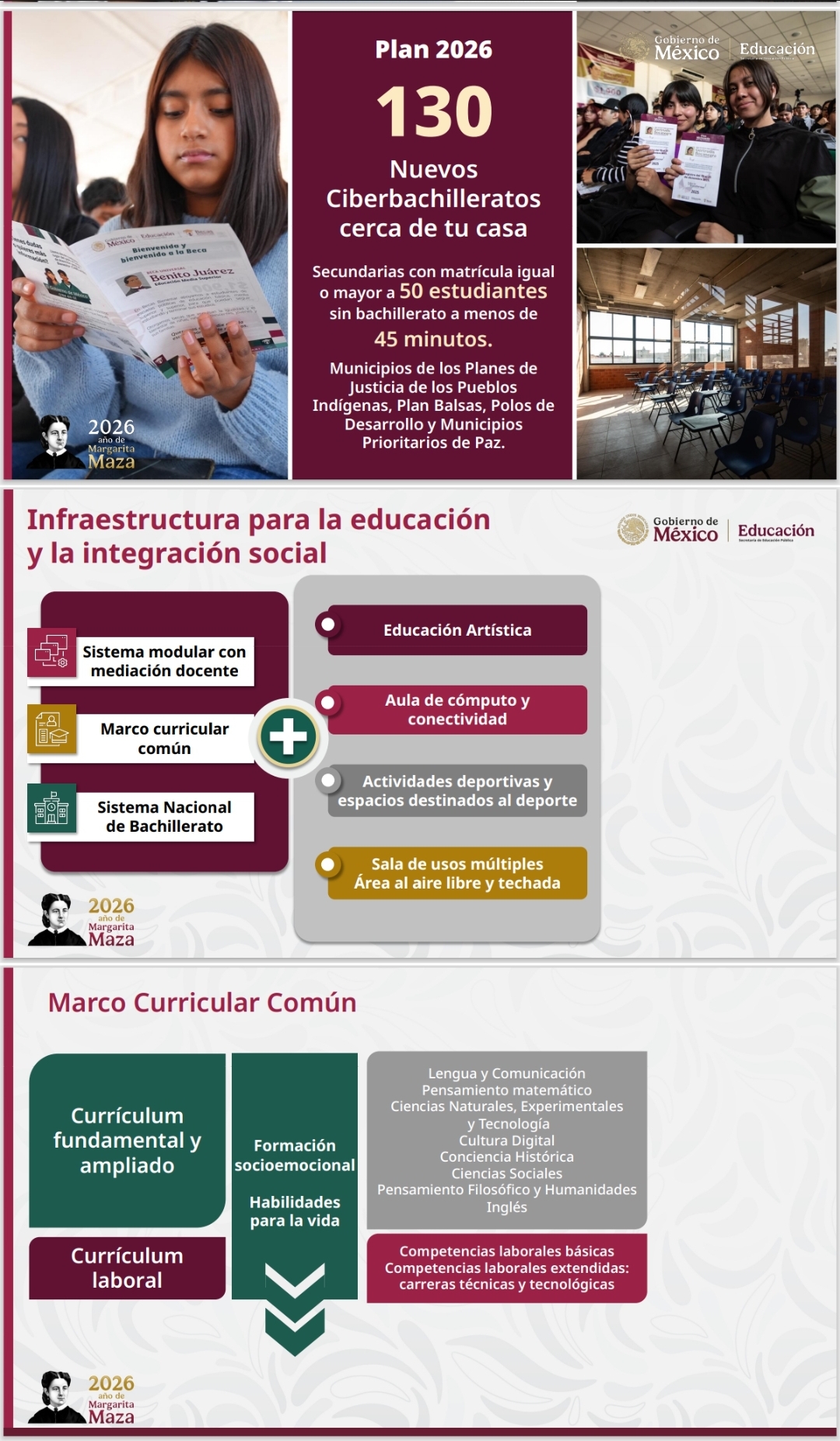 El plan incluye la construcción de 20 nuevos bachilleratos tecnológicos, 52 ampliaciones de preparatorias saturadas y 130 planteles de ciberbachillerato, un nuevo modelo educativo que busca acercar la oferta académica a comunidades donde no existe una preparatoria a menos de 45 minutos de distancia.
