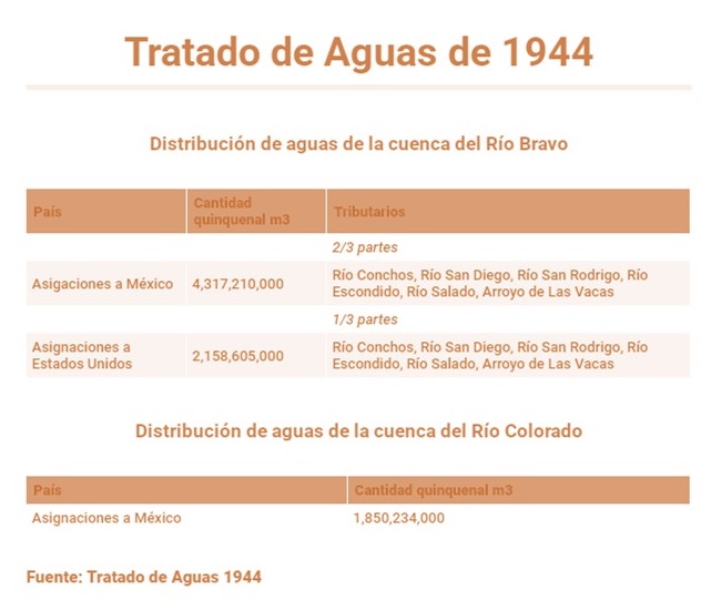 - La Comisión Internacional de Límites y Aguas entre México y Estados Unidos (CILA) indica que en 1948, posterior a que México cediera parte de su territorio a Estados Unidos, ambas partes establecieron acuerdo sobre cómo ejercer los derechos y obligaciones de estos recursos hídricos y de la frontera.