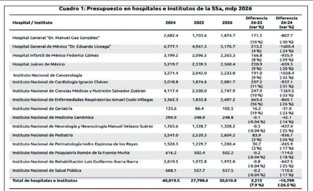 - El Proyecto de Presupuesto de Egresos contempla recortes significativos a los Institutos Nacionales de Salud y hospitales de alta especialidad, instituciones que atienden a la población más vulnerable del país.