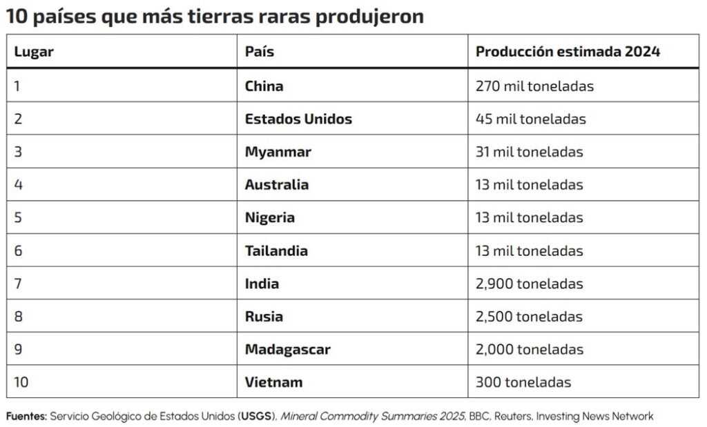 - Las tierras raras están en la Lista 2025 de Minerales Críticos de Estados Unidos, por su importancia económica y de seguridad nacional (USGS)