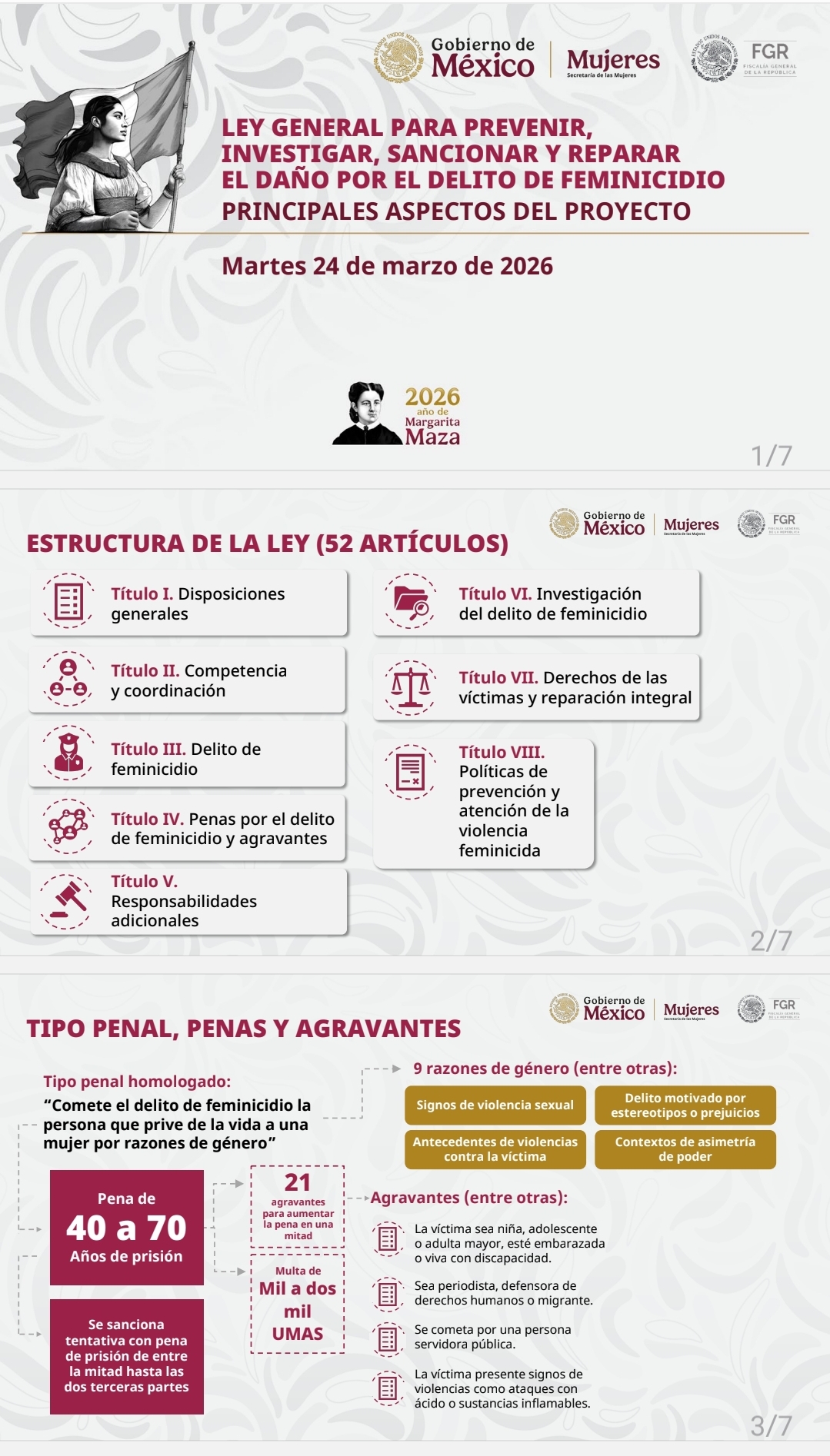 - Penas y Agravantes: Establece de 40 a 70 años de prisión y multas de mil a dos mil UMAs. Incluye agravantes cuando la víctima sea menor, adulta mayor, persona con discapacidad, migrante o de pueblos originarios.