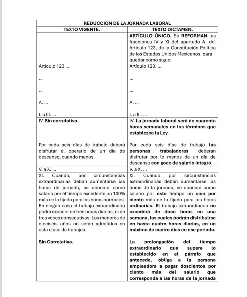 - Elevación a rango constitucional: Se reforma el Artículo 123, Apartado A, para establecer de manera formal una jornada laboral de 40 horas semanales.