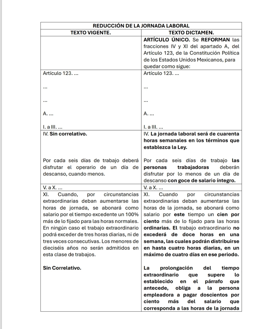 - Una adición significativa por parte de los legisladores fue la inclusión explícita de la protección a la infancia en el artículo 123, estableciendo la prohibición textual de que los menores de dieciocho años laboren tiempo extraordinario, una cláusula de seguridad que no aparecía detallada en el articulado de la propuesta de reforma a la ley secundaria enviada por el Ejecutivo.