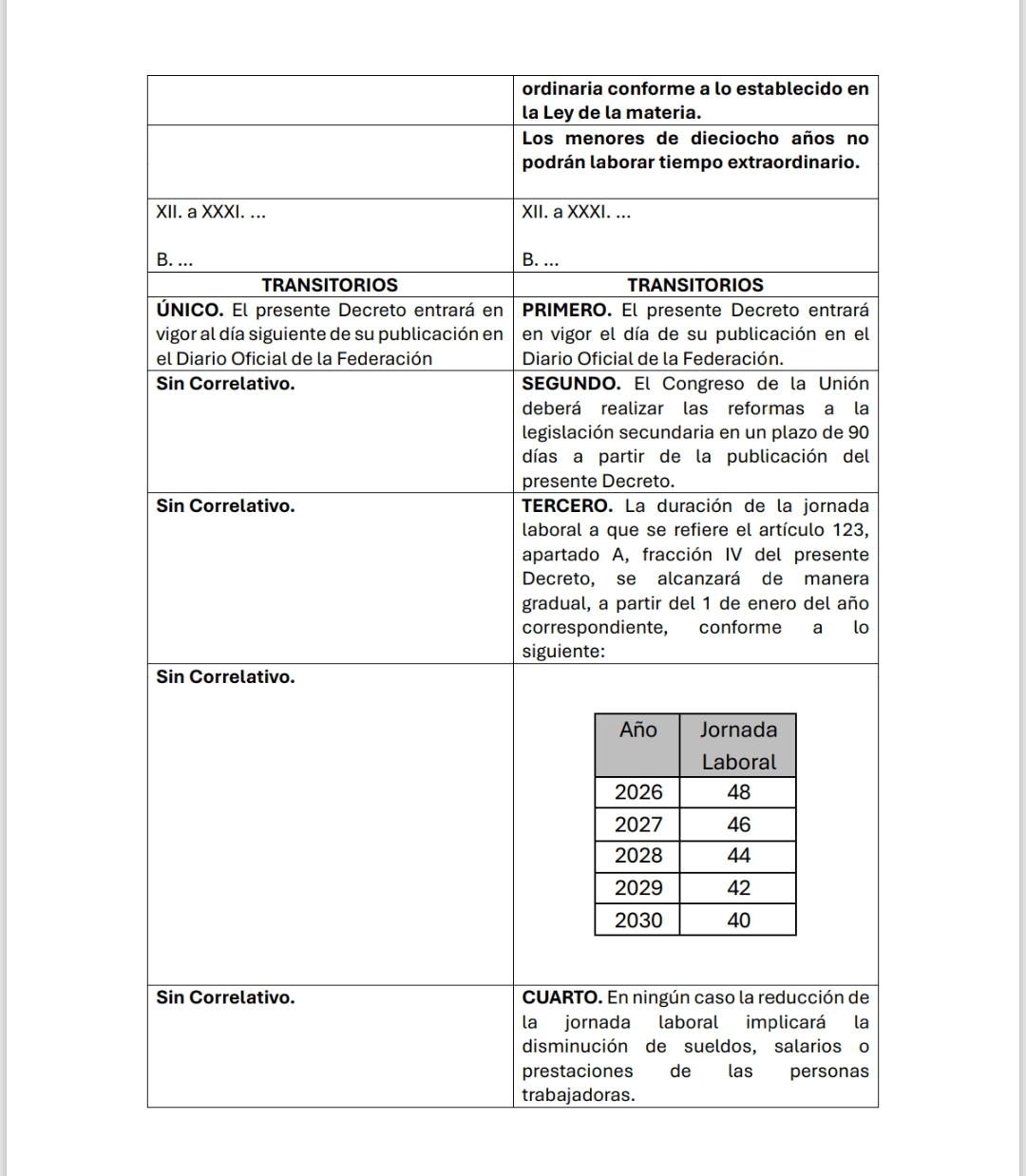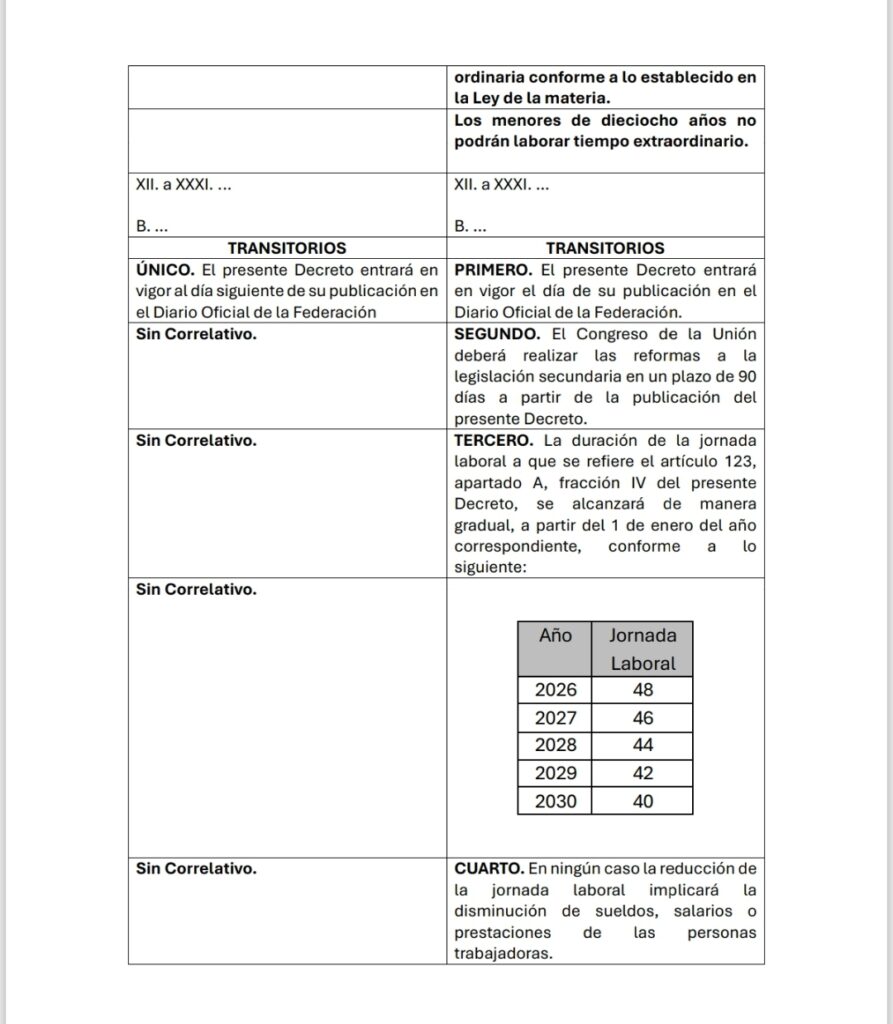 - La reducción gradual de horas (48 a 40) está claramente detallada en el transitorio solo para la jornada diurna. No obstante, no se menciona la jornada mixta (45 horas) ni la nocturna (42 horas).