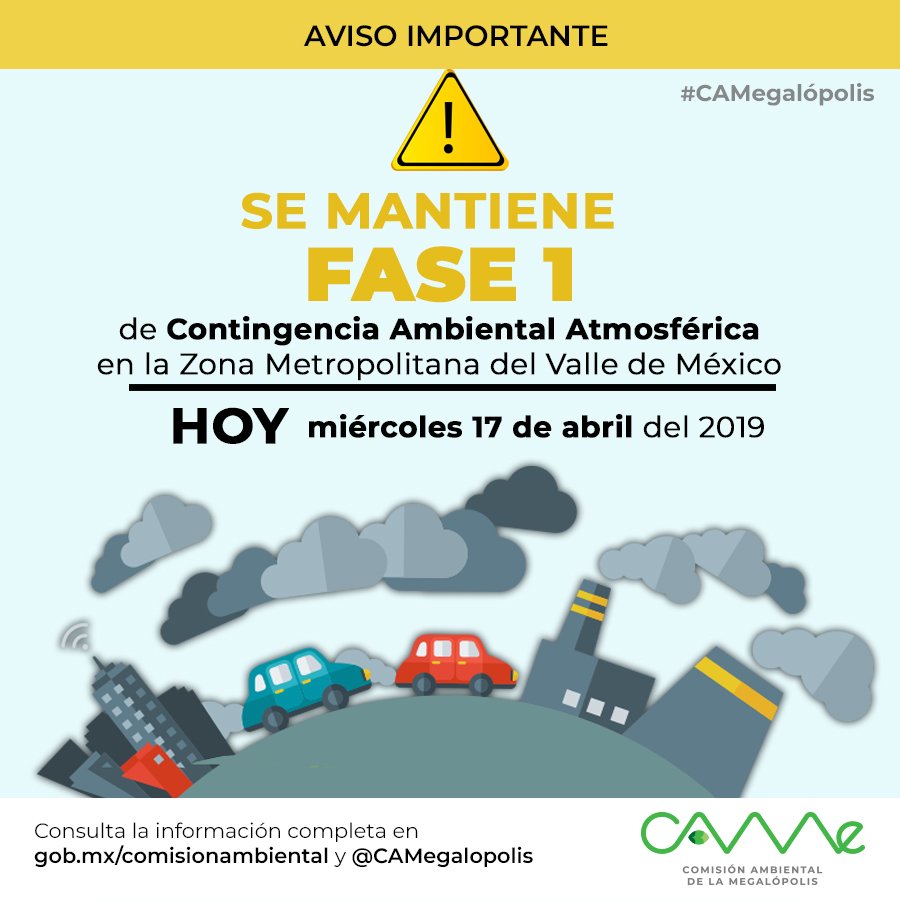 Hoy miércoles 17 de abril, SE MANTIENE la FASE 1 de #ContingenciaAtmosférica por ozono en la #ZMVM.