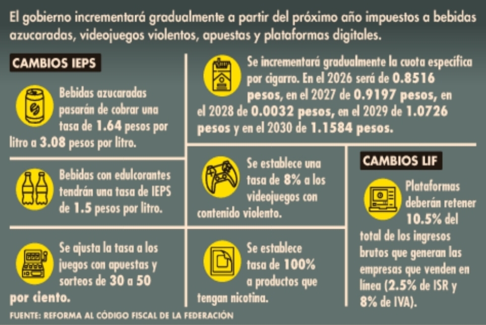 El pleno de la Cámara de Diputados avaló, en lo general, las modificaciones a la Ley del Impuesto Especial sobre Producción y Servicios (IEPS), las cuales constan de la actualización del impuesto que se cobra a refrescos, tabacos, así como la creación de uno enfocado a videojuegos de «contenido violento».