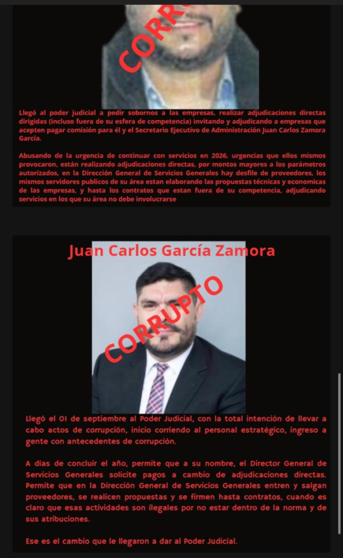 Especificaron que quienes encabezan esa presunta red de extorsionadores, son Juan Carlos Zamora García con fecha de nacimiento 21 de marzo de 1979, cuya edad es de 46 años, originario del estado de Durango, con CURP es ZAGJ790321HDGMRN00, quien ingresó el 01 de septiembre de 2025 al Poder Judicial de la Federación en el Órgano de Administración Judicial como Secretario Ejecutivo de Administración.