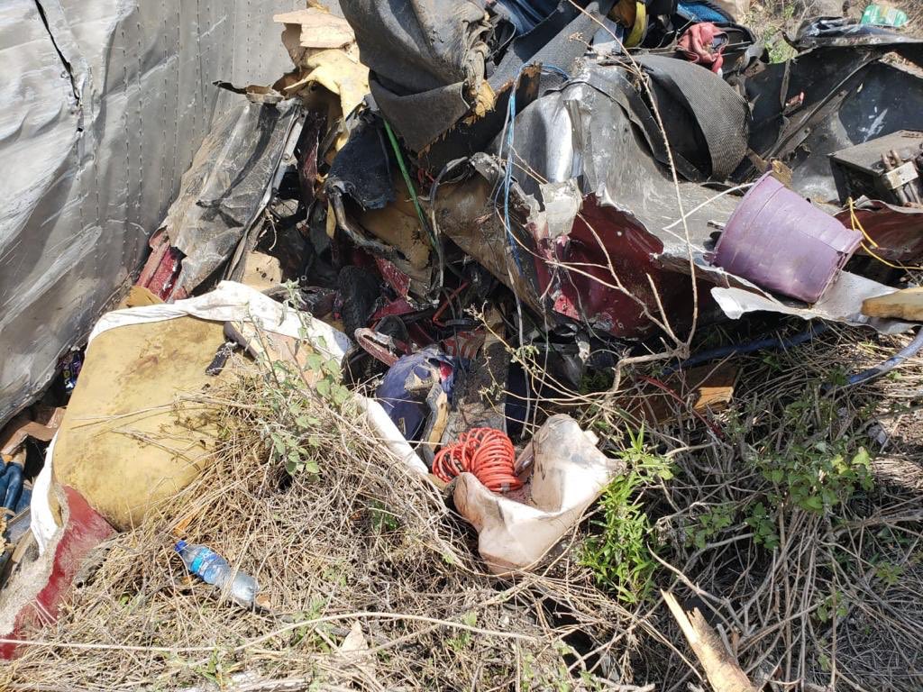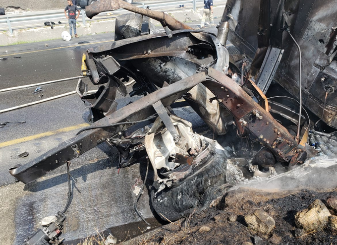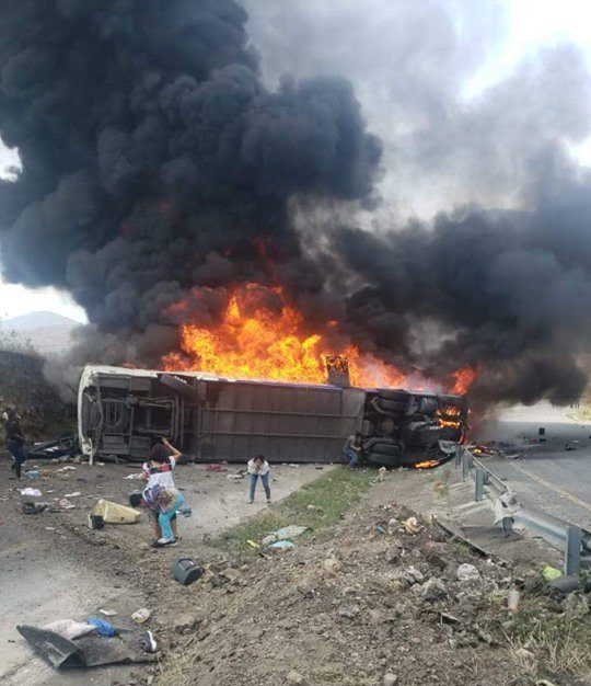 Imágenes de televisoras locales muestran al autobús volcado sobre la carretera totalmente calcinado y reducido a fierros retorcidos por las llamas, mientras que la parte frontal del camión de carga quedó por completo deshecha.